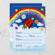 Convites de festa do Navio Foguete para qualquer ocasião. Navio foguete vermelho brilhante irrompendo através de nuvens brancas fofas para voar sobre alguns planetas felizes e um arco-íris colorido e estrelas. Use o convite como está ou substitua o texto em qualquer um dos modelos.