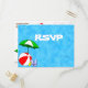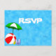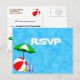 Um modelo de cartão-postal de RSVP de festa na praia ou piscina personalizável com uma bola de praia e guarda-sol de um lado e espaço para o seu endereço de retorno e informações do convidado no verso em letras divertidas. Personalize-o para alterar fontes, tamanho e muito mais, até salve seu design para mais tarde.