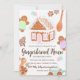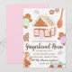 Uma adorável casa de pão de mel pingando de glacê branco nevado e enfeites de doces pastéis. Lindas janelas cor-de-rosa e uma porta arqueada em uma moldura marrom de especiarias de canela. Gomas, biscoitos de gengibre, chocolate quente e uma colher de pau enquadram o texto do convite.