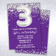 Convite de aniversário roxo e prateado com 3 anos de idade, convite de aniversário com brilho e moderno escrevendo de escrita e balões de folha divertida.
