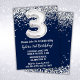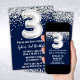 convite de aniversário azul marinho e prata de 3.ª convite de aniversário de idade 3 com brilho e moderno roteiro escrevendo e balões de folha divertida.
