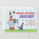 Comece sua festa com nosso Convite de aniversário de diversão de circo giro e colorido com um elefante de circo, um macaco segurando balões e uma vara de circo em um fundo de listras azuis. O fundo do convite tem uma tenda de circo e um palhaço de circo! Perfeito para um primeiro aniversario ou qualquer aniversário... apenas mude o aniversário. Totalmente personalizável por você com suas informações. ©Corazón Dulce