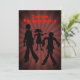 Zombie convites de festas de aniversário ou Halloween. Três zumbis mortos caminhando na frente com texto vermelho brilhante e personalizado para o tipo de festa. No verso, personalize um parágrafo do texto para todas as informações da parte. A fonte vermelha grunge é usada e impressa sobre preto. O mesmo design de explosão estelar decora ambos os lados.