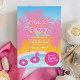 Um convite de festa de solteira rosa divertido com palmeiras de cores brilhantes, uma piscina, flamingo e boias de rosquinha. Adicione o nome da solteira no círculo cor-de-rosa na parte inferior.