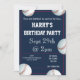 convite de festas com tema de beisebol, editável para que você possa alterar os detalhes de saudação, nome, data/hora, local e RSVP com distribuição, disponível em outras cores.