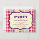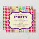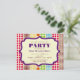 Um convite de festas genérico com todos os objetivos apresentando um plano de fundo de linhas de bolinhas em vários tamanhos e cores inspiradas pela boêmia na frente e no verso. Personalize o quadro de dentro de texto roxo e burro na frente com detalhes da sua ocasião.