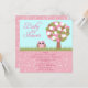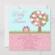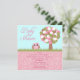 Este convite do chá de fraldas 5.25x5.25 tem uma coruja cor-de-rosa sentar-se atrás de alguma grama ao lado de uma árvore colorida. O chá de fraldas é escrito ao lado da coruja. Na metade inferior disto convide, ele tem um design cor-de-rosa do redemoinho com sua informação customizável do partido.