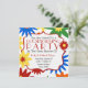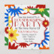 Um convite de festas do housewarming que caracteriza um fundo de flores inspiradas retros em várias máscaras brilhantes de alaranjado, de vermelho, de verde, de amarelo, e o azul na parte dianteira e na parte traseira. Personalize o texto dentro do quadro branco do suporte esboçado no vermelho.