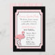 convite de festas de estilo Chic Art Deco feito em um padrão de stripe vertical, rosa e branco, com um quadro decorativo preto. Gráficos de um flamingo cor-de-rosa decoram o canto inferior esquerdo do convite. Personalize todo o texto para atender às suas necessidades de evento.