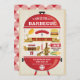 Um grito de churrasco de chaleira vermelha com todos os guloseimas para a festa de churrasco. Personalize com seu próprio texto. O "Junte-se a nós para um churrasco" pode ser removido, se necessário. Os itens de Barbeque incluem: cachorro-quente, hambúrguer, frango, milho, placa de papel, banners, ketchup, garrafa de cerveja, garfo e faca. O fundo tem um fundo de grãos de madeira em apuros. A parte de trás da carta apresenta uma toalha de mesa de piquenique giratória. Ilustração Original por pj_design.