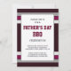 Este design ousado, masculino, apresenta faixas vermelhas e cinzas sobre um fundo castanho avermelhado profundo. O texto personalizável para o tipo de evento de Dia de os pais (CHURRASCO, bolacha, brunch, janta, festa etc.) e local, RSVP e detalhes de contato aparecem dentro área branca borda dourada no centro, em tipografia popular, vermelha e preta na frente da placa. A parte traseira da placa possui as mesmas listras azuis e beges em negrito.