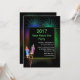 Convite de festas colorido feito a preto, com gráficos de fogos de artifício coloridos de neon, no fundo. Gráficos de dois foguetes de fogo decoram o lado inferior esquerdo da área de texto preto de borda verde. Personalize todo o texto da sua festa de Anos novos.