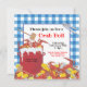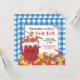 Convite de festas de Caranguejo Super Divertido. Pote vermelho quente de caranguejo com milho na pata, batatas e limões, palete e utensílios de caranguejo sentam-se num jornal com um fundo azul estampado em tableta. Ilustração desenhada à mão por McBooboo.