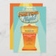 Game Show Night Invitation apresentando um sinal tipográfico de "Game Show Night''. Esses designs incluem elementos de azul, amarelo, vermelho e laranja, um jogo de show podium, sinal de iluminação e elementos inspirados em shows retrorados de jogos. Os produtos incluem um modelo para personalização pessoal.