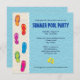 Adicione diversão extra à sua festa de verão com este convite de festas! Uma linha de chinelos se alinham ao longo de um fundo stucco colorido de areia que imita uma superfície de concreto de piscina. As informações personalizadas da parte estão posicionadas sobre um fundo de stucco azul-céu. Disponível com produtos correspondentes.