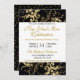 Um convite elegante e moderno para a celebração do Ano Novo. Apresenta um na moda dourado e design preto com guião dourado e reverte para um padrão dourado e preto. Fácil de personalizar com as informações da sua festa. Celebre em estilo com este belo convite de Cherry Lane Designs! Design por Rosalind Moore©