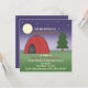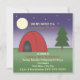 Um convite de aniversário temático de acampamento que caracteriza uma ilustração de uma barraca vermelha, de uma grama verde, de uma árvore verde, e de um céu nocturno com lua e estrelas. Personalize o texto com detalhes de sua ocasião. O lado oposto é azul.