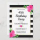 Este belo e clássico design apresenta flores cor-de-água rosa pintadas manualmente contra um fundo de alto contraste de listras brancas e pretas. No centro está uma área branca de cor dourada contendo o texto personalizável para seu dia especial em tipografia popular e elegante.