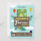 Tenha um bom aniversário com este convite fantástico para dinossauros! Possui um dinossauro verde sorridente com balões e nuvens.