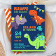 Surpreenda seus convidados com este convite de aniversário legal com dinossauros coloridos brilhantes com tipografia vibrante sobre um fundo azul. Basta adicionar os detalhes do seu evento neste modelo fácil de usar para torná-lo um convite de tipo único. Sacudir a placa para revelar um padrão laranja elegante na parte traseira da placa.