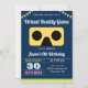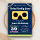 Surpreenda seus hóspedes com este convite legal para festas de aniversário, com um fone amarelo de realidade virtual com tipografia moderna contra um fundo azul marinho. Basta adicionar os detalhes do seu evento neste modelo fácil de usar para torná-lo um convite de tipo único. Sacudir a placa para revelar um padrão colorido de listras na parte traseira da placa.