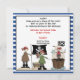Convite de festas de aniversário de criança pirata que apresenta um navio pirata com bandeira de pirata do Skull e Cross Bones Pirate, uma caixa de tesouro de booty do pirata e alguns piratas bonitos para crianças, um com gancho e um papagaio no braço, outro com um mapa do tesouro e uma espada e todos eles com manchas oculares. Há uma borda listrada ao redor com listras azuis e brancas. Um design perfeito adorável para qualquer criança, que escolheu um tema pirata para o seu partido. Preto, marrom, vermelho, branco, verde, azul, bege.