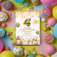 Um tema de aniversário doce com abelhas, urso de mel, colmeia, pássaro pequeno e flores amarelas na frente e outro urso de mel nas costas! Você pode personalizar este convite com seus detalhes.