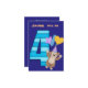 Este é um design convite de aniversário colorido, com uma imagem azul e lacrimejada número quatro, e um macaco marrom giro com um chapéu de aniversário e segurando balões na frente dele. A parte superior do convite diz (Nome) será (4). A imagem e o texto são colocados sobre um fundo roxo brilhante. A parte traseira do cartão é a mesma roxa, com as informações da sua festa em branco. Maravilhoso para a quarta festa de aniversário do seu filho! *Obrigados para a Clipart Real Deal para o cliente usado para criar este design.