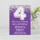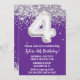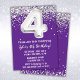 Convite de festas roxo e prateado 4 anos de idade com 4 convites de aniversário com brilho e escrevendo moderno de escrita e balões de folha divertida.