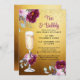 Um convite moderno para festas de férias Vésperas de ano novo com vidro de champanhe e florais, brilho de ouro em fundo de ouro. Tema de diversão. Aquarela e brilho dourado.