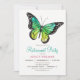 Convite de festas de aposentadoria de borboleta tropical. O convite apresenta borboleta azul-turquesa verde-lacrimogênea com padrão de flores tropicais atrás.