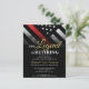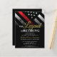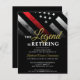 Este design apresenta uma bandeira de bombeiros com faixas pretas e brancas, e uma fina faixa vermelha de linha também. O texto "A lenda está se aposentando" fica acima de todos os detalhes do partido para o bombeiro aposentado, tenente ou chefe.