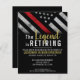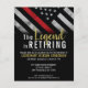 Este design apresenta uma bandeira de bombeiros com faixas pretas e brancas, e uma fina faixa vermelha de linha também. O texto "A lenda está se aposentando" fica acima de todos os detalhes do partido para o bombeiro aposentado, tenente ou chefe.