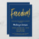 Um convite de festas elegante, simples, mas impressionante, marinho azul e ouro para aposentadoria. Texto de um script de vitamina no topo que diz "Liberdade!" com texto dourado abaixo e o nome em branco sobressalente