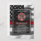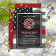 Convites de festas de aposentadoria elegantes e bombeiros que você pode personalizar para sua próxima celebração. Este design apresenta a fina bandeira vermelha do bombeiro com uma cobertura com uma borda prateada, e um emblema metálico metálico de malteses para o departamento de bombeiros da cidade.