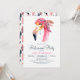 Convite de festas de aposentadoria Chic Pink Flamingo. Convidar apresenta um padrão cor-de-rosa de penas boho no verso.