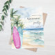 Um convite para uma festa de aposentadoria, para homens e mulheres. Uma praia arenosa de cor aquática, ondas oceânicas e palmeiras como fundo, e uma prancha de surfe azul e rosa na praia. 1 folha = 1 convite impresso de borda a borda.