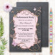 Convite de festas de aposentadoria elegante, cor-de-rosa, em borda negra e espirais metálicas de ouro rosa.
