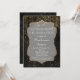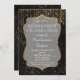 Um adorável convite de festas de reforma preto e dourado com decoração de ouro brilhante pendurada no topo com borrão estrelado no fundo.