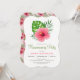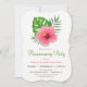 Convite para comemoração da festa de horticultura doméstica do Havaí no verão tropical. O convite apresenta flores de hibisco cor-de-rosa e folhas verdes.