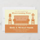 Um convite de festas moderno de aquecimento doméstico com um esquema de cor laranja. Sofá fica no centro entre mesas extremas com um vaso de flores e uma lâmpada. Personalize o texto em cima e em baixo com detalhes de sua ocasião.