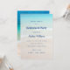 Convite de festas de aposentadoria em segundo plano. O texto azul marinho impresso é simples e perfeito para um homem que se aposenta, mas trabalha para qualquer um. Mude também o texto para outro tipo de celebração. Uma cena de luz de um oceano e areia da praia é o fundo do texto na frente. A água do oceano azul é a imagem no verso. Você pode optar por atualizar o papel, alterar o tamanho e escolher uma forma de borda.