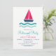 Convite de festas de aposentadoria em veleiro náutico. O Convite apresenta marinho azul, rosa, turquesa, veleiro e ondas.