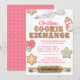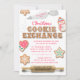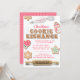 Este convite de troca de biscoitos divertidos apresenta deliciosos biscoitos de pão de fosco que soletram "troca de biscoitos" cercados por biscoitos decorados de Natal. O saco de gelo diz "você é convidado" a rosa e o pino rolante no fundo tem detalhes sobre a festa. Este convite pode ser personalizado com todos os detalhes do seu partido. O verso tem um fundo rosa com bolinhas brancas.