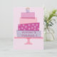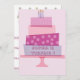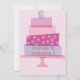 Este adorável convite de bolo de aniversário rosa para qualquer festa de aniversário! Um bolo de aniversário sentado em uma banca de bolo rosa com níveis de pinks, bolinhas e cores roxas.