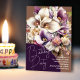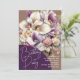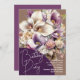 Convite de aniversário com belos buquês de lírios. Escolha os adoráveis cartões impressos para enviar e-mails, ou pague um preço baixo e faça o download instantâneo para compartilhar on-line. As cores são lavanda, roxo, esbranquiçado e bege. O grande buquê é o foco principal por trás do script de "Festa de aniversário" sobre um círculo parcial roxo escuro na parte inferior. Todas as informações da parte, incluindo o nome da honra, data, hora e local, são impressas e alinhadas à direita no canto inferior. O reverso é roxo sólido.