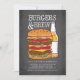 Hambúrgueres modernos e divertidos de chalkboard e bico de cerveja convidando uma garrafa de cerveja com hambúrgueres enormes colocados sobre um fundo preto de chalkboard e um pano de checker vermelho correspondente para um toque especial. O hambúrguer popular convida para o seu churrasco de verão se reunir.
