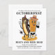 Duas mascotes retrô - uma pulseira e um copo de cerveja - convidam amigos e família para a reunião de Octoberfest. Ambos os mascotes estão vestindo seus chapéus alpinos. Todo texto é facilmente editável. Este convite está disponível como download digital.