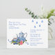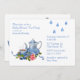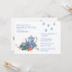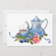 convite de festas de chá de chá de fraldas bonito, feito em um estoque de cartão branco, com gráficos adoráveis de um conjunto de chá azul e branco, com rosa, bagas azuis e gotas de chuva. Personalize o texto azul para o seu próximo chá. Também adorável por chás de panela.