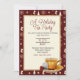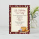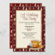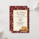Convite de festas de chá de Natal, feito em vermelho escuro, com flocos de neve de marfim, árvores e estocagem. Uma área de texto de marfim borrado em ouro tem gráficos de uma xícara de chá de ouro, decorando a parte inferior da área de texto. Personalize os campos de texto personalizados para atender às suas necessidades de festa de Natal.